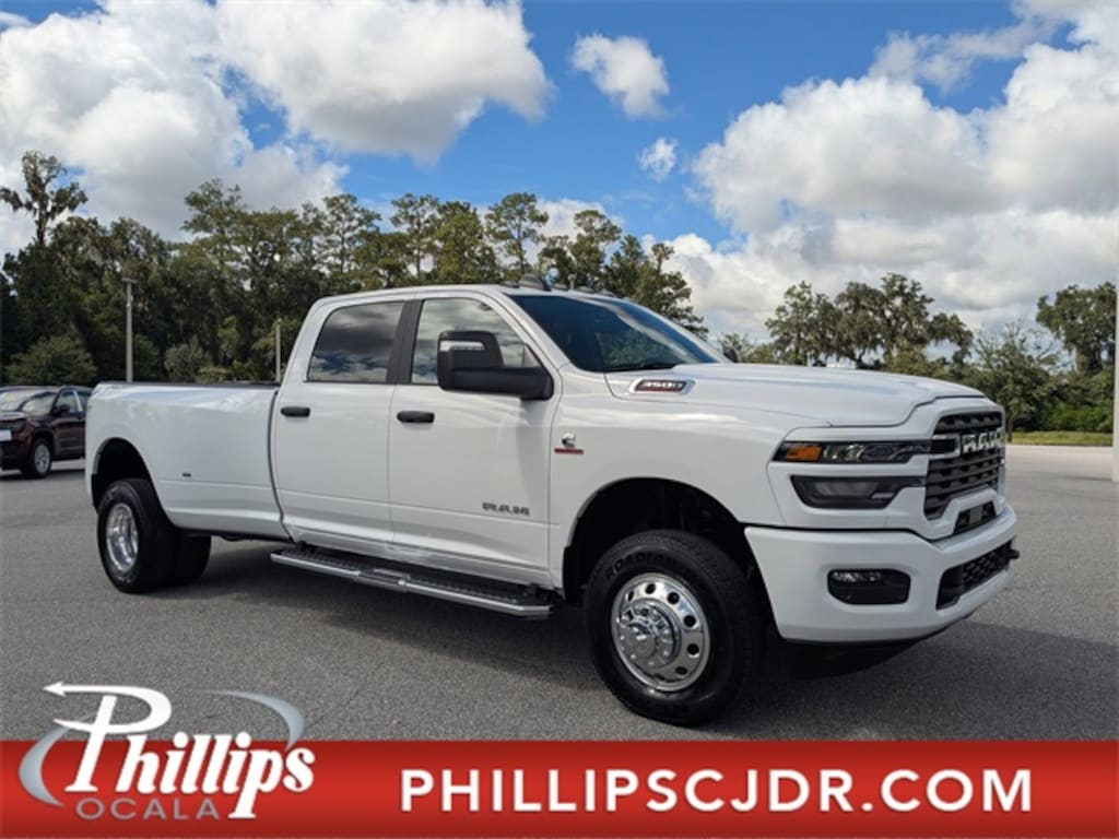 Equipped with Big Horn Level 1 Plus Equipment Group (12" Touchscreen Display, 2 Way Rear Headrest Seat, 2nd Row In Floor Storage Bins, 4 Way Front Headrests, 40/20/40 Split Bench Seat, 4G LTE Wi-Fi Hot Spot, 9 Alpine Speakers w/Subwoofer, Air Conditioning ATC w/Dual Zone Control, Alexa Built-In, Apple CarPlay, Auto Power-Folding Mirrors, Auto-Dimming Rear-View Mirror, Black Exterior Mirrors, Cloth 40/20/40 Premium Bench Seat, Connected Travel & Traffic Services, Connectivity - US/Canada, Disassociated Touchscreen Display, Dual Glove Boxes, Emergency Vehicle Alert System (EVAS), Exterior Mirrors Courtesy Lamps, Exterior Mirrors w/Heating Element, Exterior Mirrors w/Supplemental Signals, Foam Bottle Insert (Door Trim Panel), Folding Flat Load Floor Storage, Footwell Courtesy Lamp, For Details Visit DriveUconnect.com, For More Info, Call 800-643-2112, Forward & Reverse Utility Lights, Front Armrest w/Cupholders, Front Center Seat Cushion Storage, Front Seat Back Map Pockets, Global Telematics Box Module (TBM), Glove Box Lamp, Google Android Auto, GPS Antenna Input, GPS Navigation, HD Radio, Integrated Voice Command w/Bluetooth, LED Bed Lighting, Locking Lower Glove Box, Luxury Steering Wheel, Manual Adjust 4-Way Front Passenger Seat, Mirror Running Lights, MOPAR Deployable Bed Step, MOPAR Spray In Bedliner, Off-Road Information Pages, Power 2-Way Driver Lumbar Adjust, Power Adjust 8-Way Driver Seat, Power Adjust Mirrors, Power Heated Fold Telescopic Mirrors, Power Telescoping Mirrors, Power-Adjustable Convex Aux Mirrors, Radio: Uconnect 5 Nav w/12.0" Display, Rear 60/40 Folding Seat, Rear Dome w/On/Off Switch Lamp, Remote Start System, Remote USB Port - Charge Only, Selectable Tire Fill Alert, SiriusXM Radio Service, SiriusXM w/360L, Steering Wheel Mounted Audio Controls, Storage Tray, and Trailer Tow Pages), Quick Order Package 24Z Big Horn, Sport Appearance Package (Black Interior Accents, Body Color Grille Surround, Painted Front Bumper, Painted Rear Bumper, and Sport Decal), 4-Wheel Disc Brakes, 50 Gallon Fuel Tank, 5th Wheel/Gooseneck Towing Prep Group, 6 Speakers, 6000# Front Axle w/Hub Ext, ABS brakes, Air Conditioning, Alloy wheels, AM/FM radio: SiriusXM, Apple CarPlay/Android Auto, Box & Rear Fender Clearance Lamps, Brake assist, Bumpers: chrome, Center Hub, Chrome Flat Cab-Length Side Steps, Clearance Lamps, Cloth 40/20/40 Bench Seat, Compass, Delay-off headlights, Driver door bin, Dual front impact airbags, Dual front side impact airbags, Dual Rear Wheels, Electronic Stability Control, Front anti-roll bar, Front Center Armrest w/Storage, Front fog lights, Front License Plate Bracket, Front reading lights, Fully automatic headlights, Heated door mirrors, Illuminated entry, Low tire pressure warning, Manual Adjust 4-Way Driver Seat, MOPAR Front & Rear Rubber Floor Mats, Nexen Brand Tires, Occupant sensing airbag, Outside temperature display, Overhead airbag, Overhead console, Panic alarm, ParkView Rear Back-Up Camera, Passenger door bin, Passenger vanity mirror, Power door mirrors, Power steering, Power windows, Radio data system, Radio: Uconnect 5 w/8.4" Display, Rear Folding Seat, Rear seat center armrest, Rear step bumper, Rear Wheelhouse Liners, Rear window defroster, Remote keyless entry, Speed control, Tachometer, Tilt steering wheel, Traction control, Trip computer, Turn signal indicator mirrors, Variably intermittent wipers, Voltmeter, Wheels: 17" x 6.0" Polished Aluminum, and Wheels: 18" x 8.0" Polished AluminuM. Price includes: $1000 - 2026 National Bonus Cash . Exp. 11/03/2025